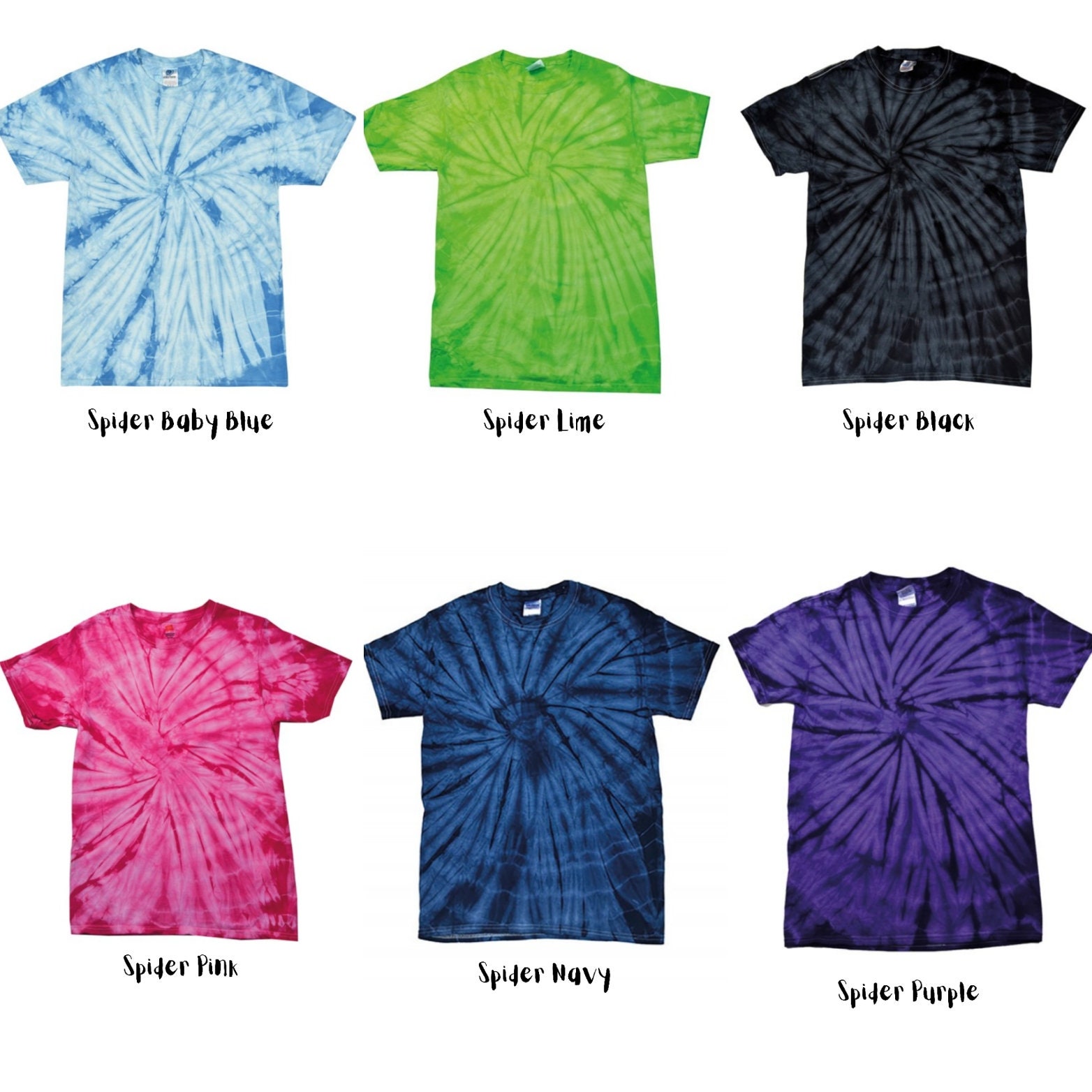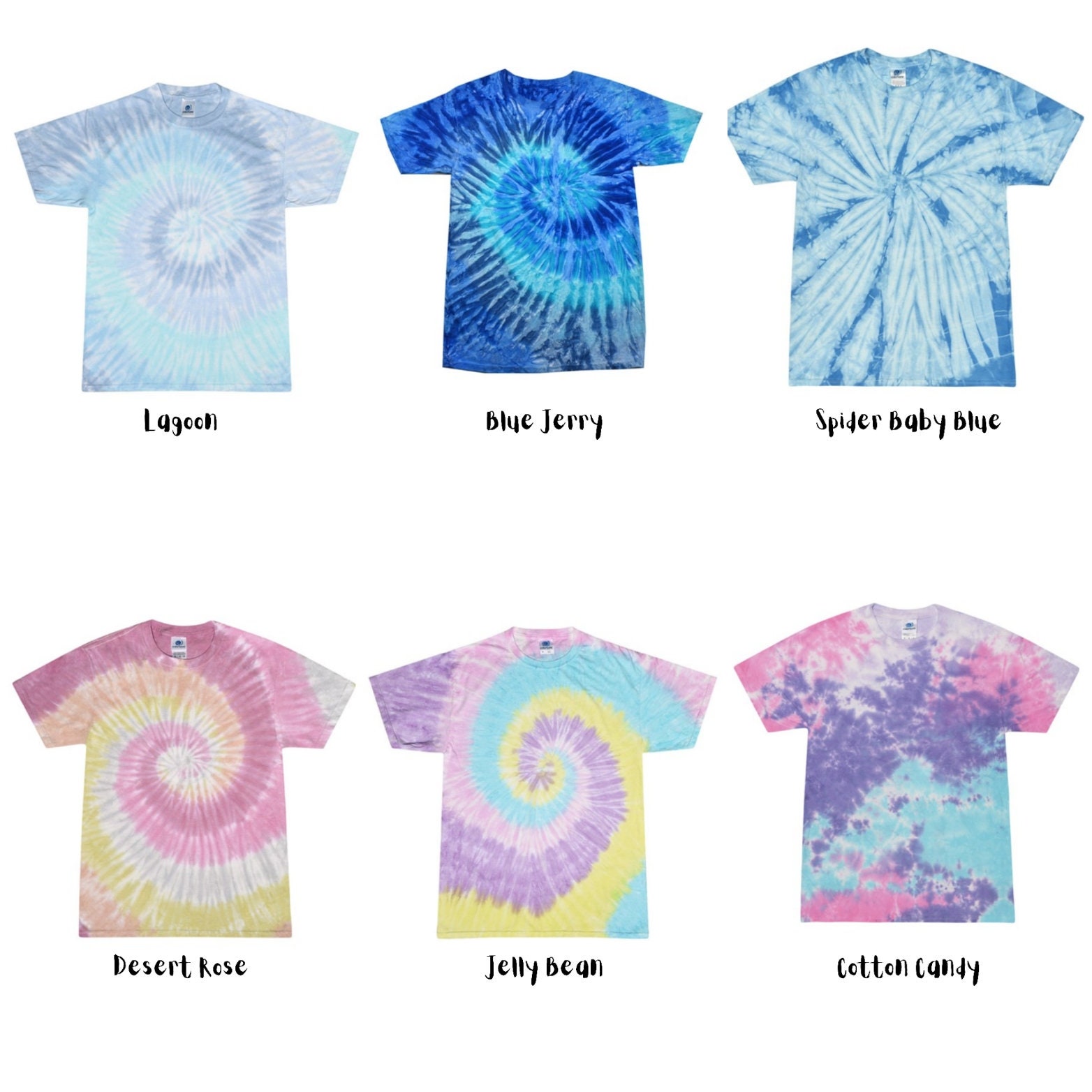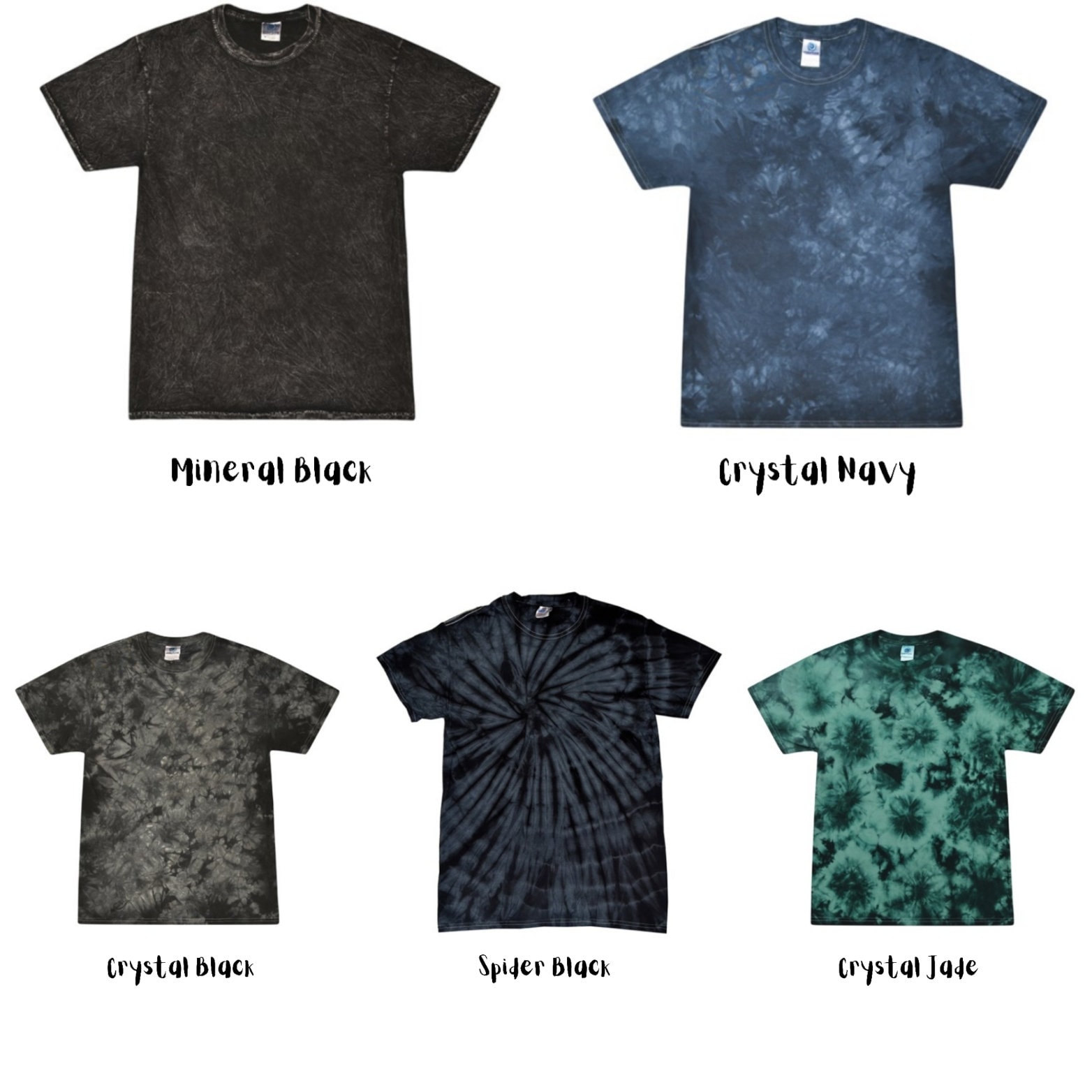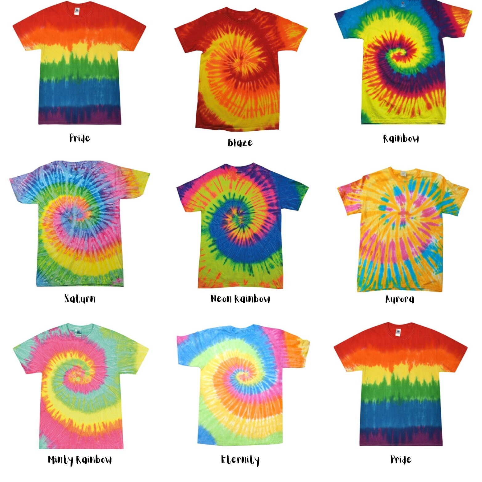 Hand-dyed tie-dye T-shirts. Many colours and patterns to choose from. Unisex fit. Organic heavyweight cotton.
