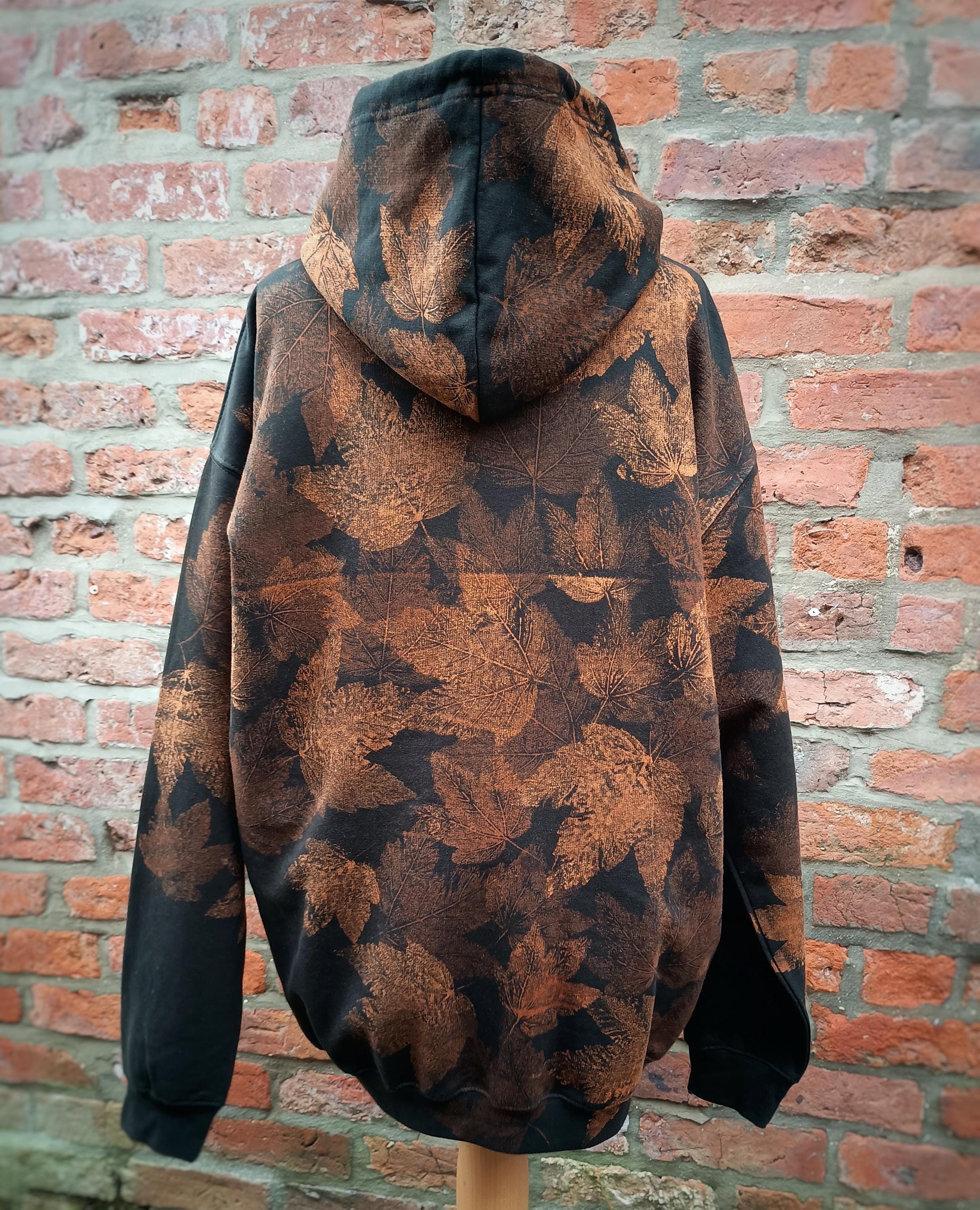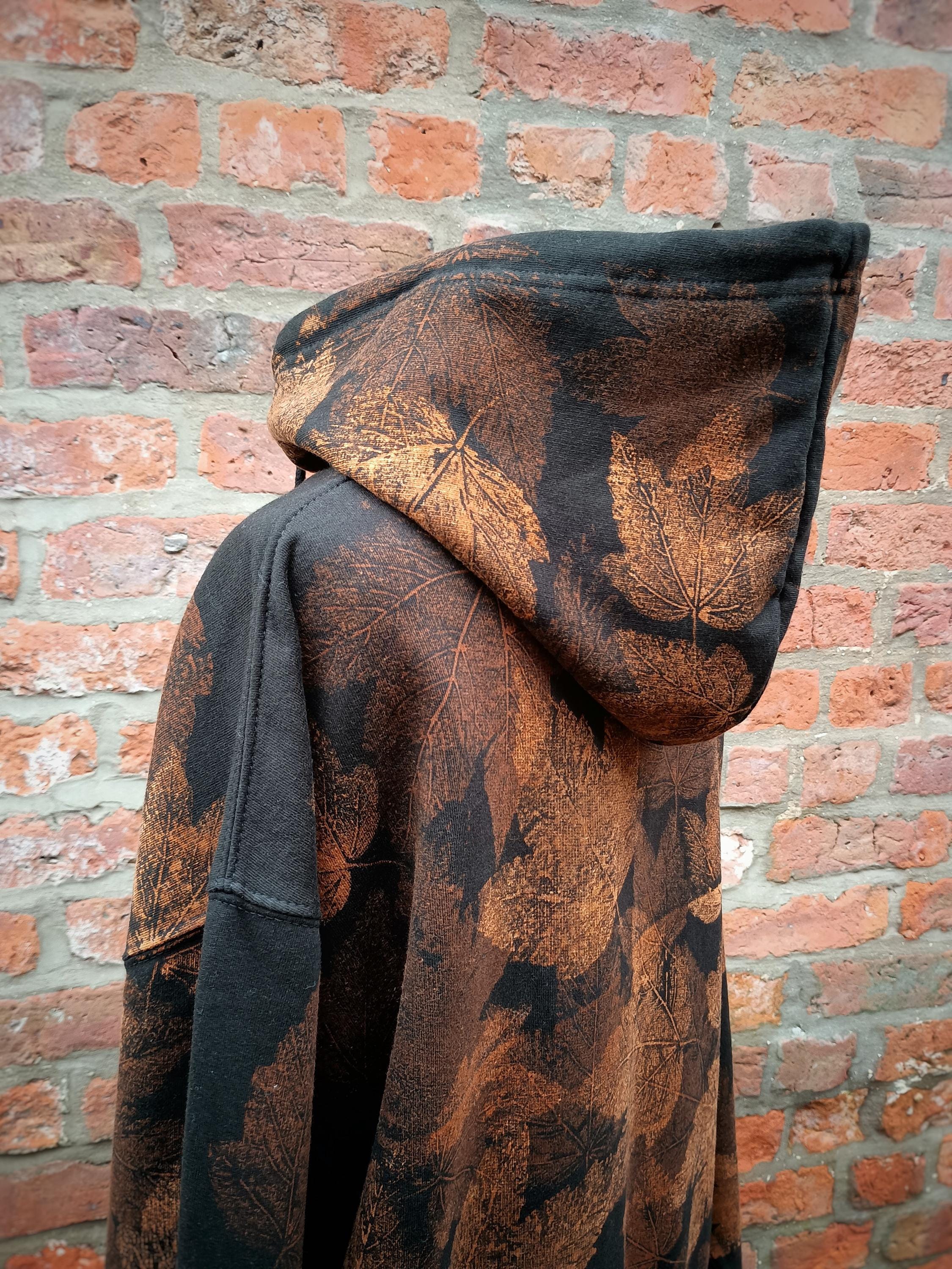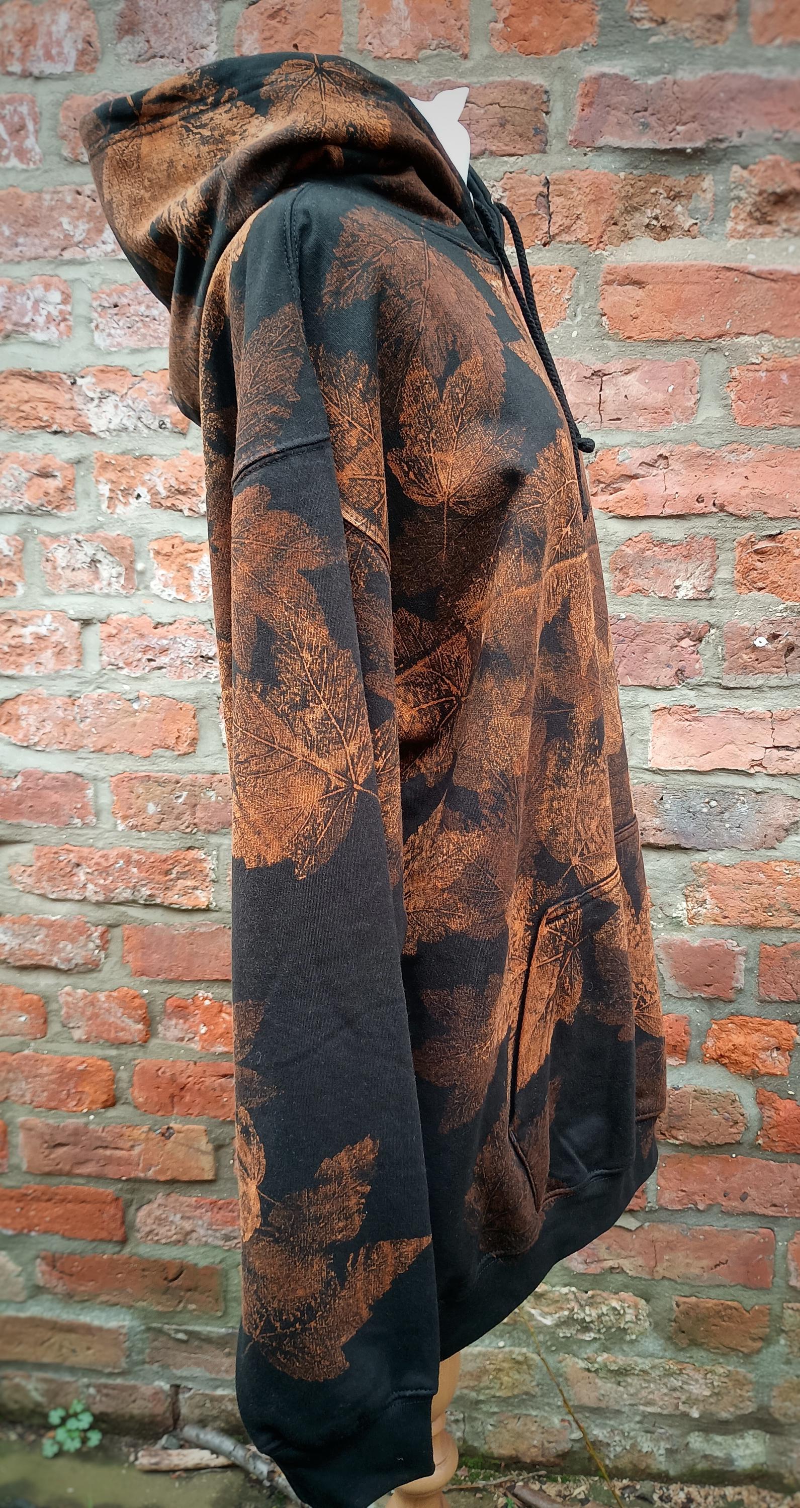 Every piece is a wearable canvas. The unique leaf prints—featuring maple, oak, and other classic autumnal shapes—are applied using a specialized reverse-dye/bleach technique. This process removes the dye from the fabric, leaving behind a beautiful, coppery-rusty print that stands out brilliantly against the rich black material. The intentional placement on the back, hood, sleeves and front ensures you carry a piece of the forest wherever you go.