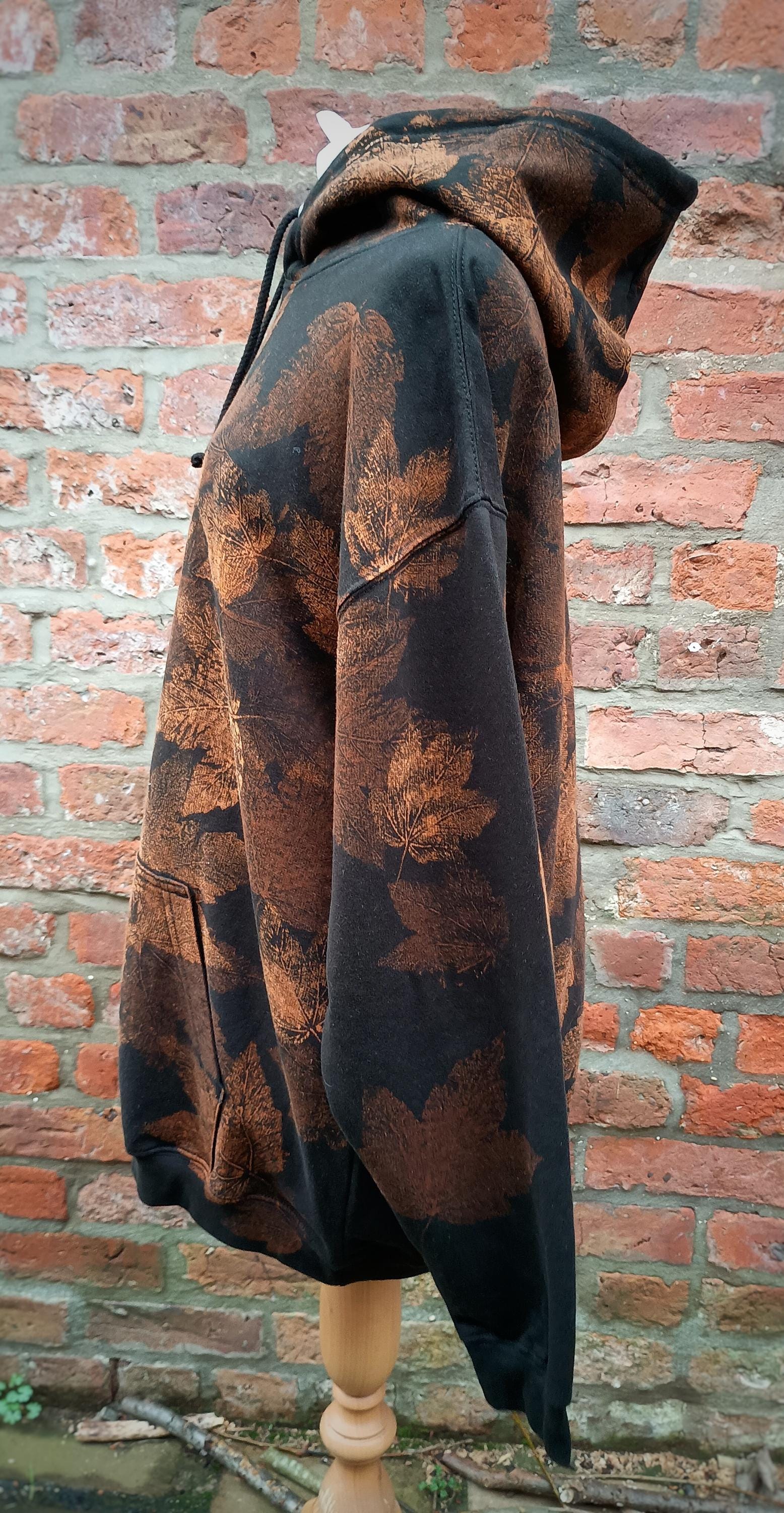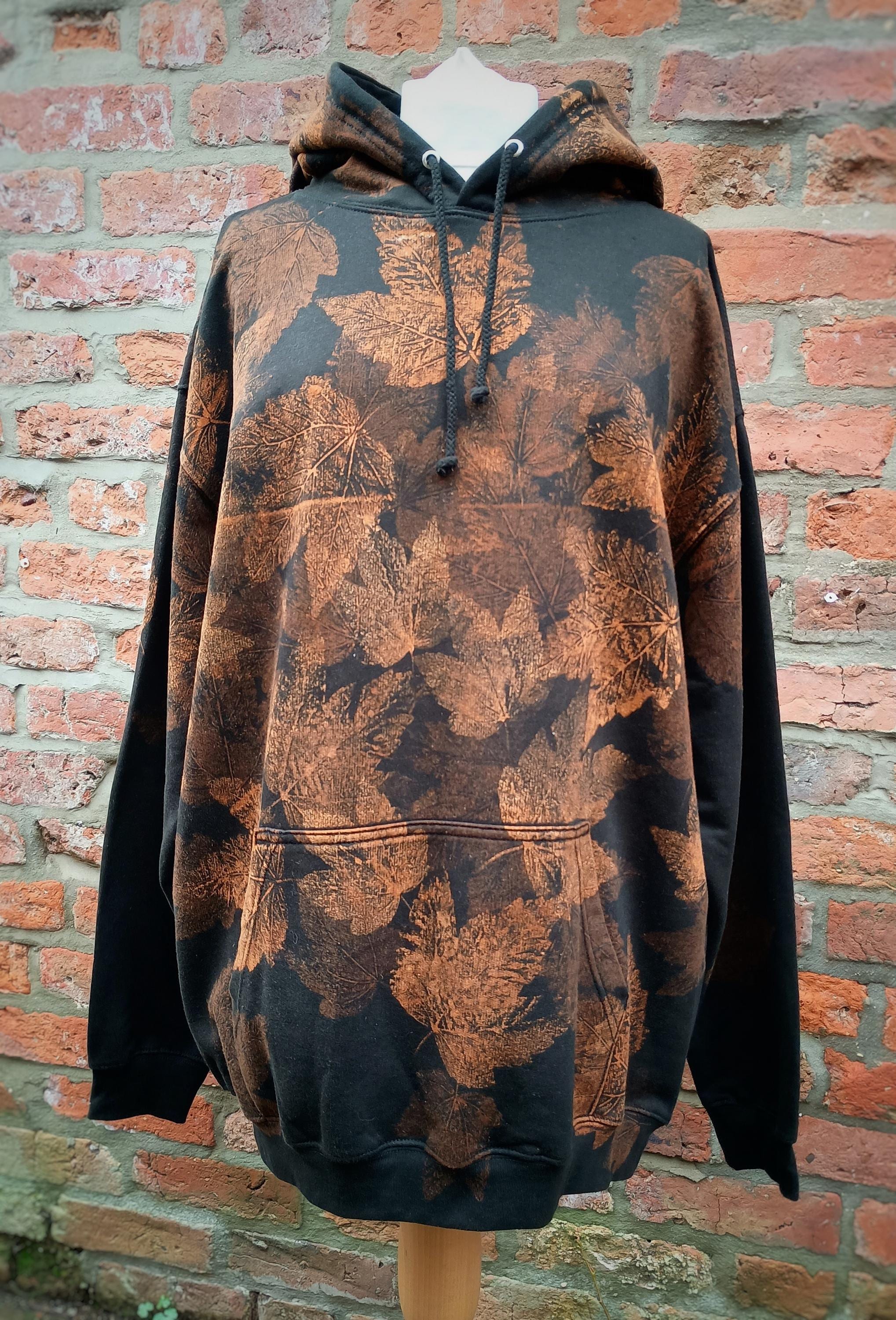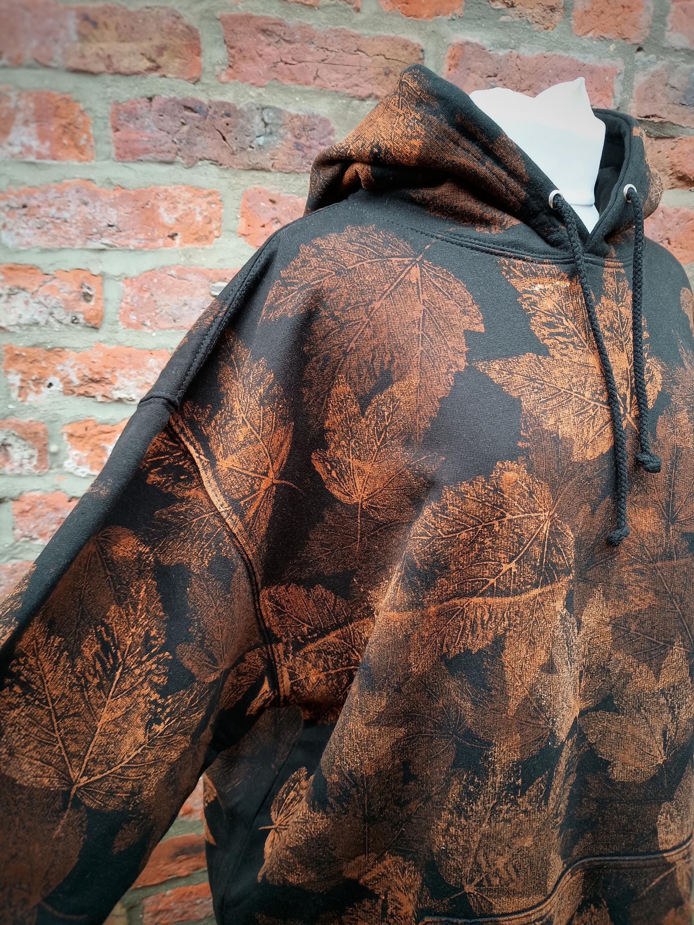 Every piece is a wearable canvas. The unique leaf prints—featuring maple, oak, and other classic autumnal shapes—are applied using a specialized reverse-dye/bleach technique. This process removes the dye from the fabric, leaving behind a beautiful, coppery-rusty print that stands out brilliantly against the rich black material. The intentional placement on the back, hood, sleeves and front ensures you carry a piece of the forest wherever you go.