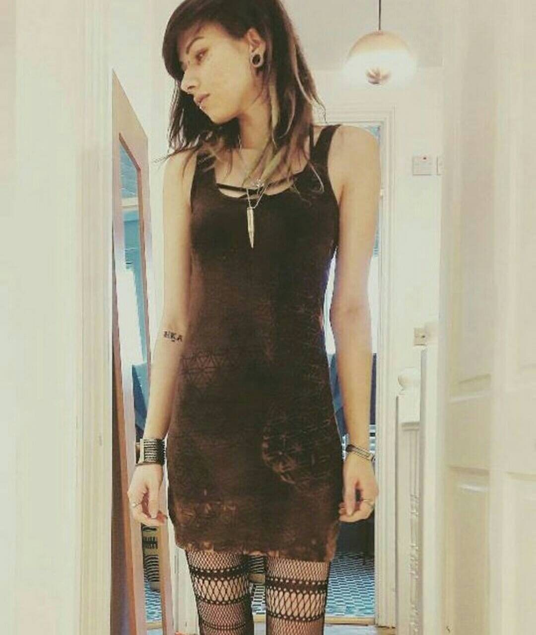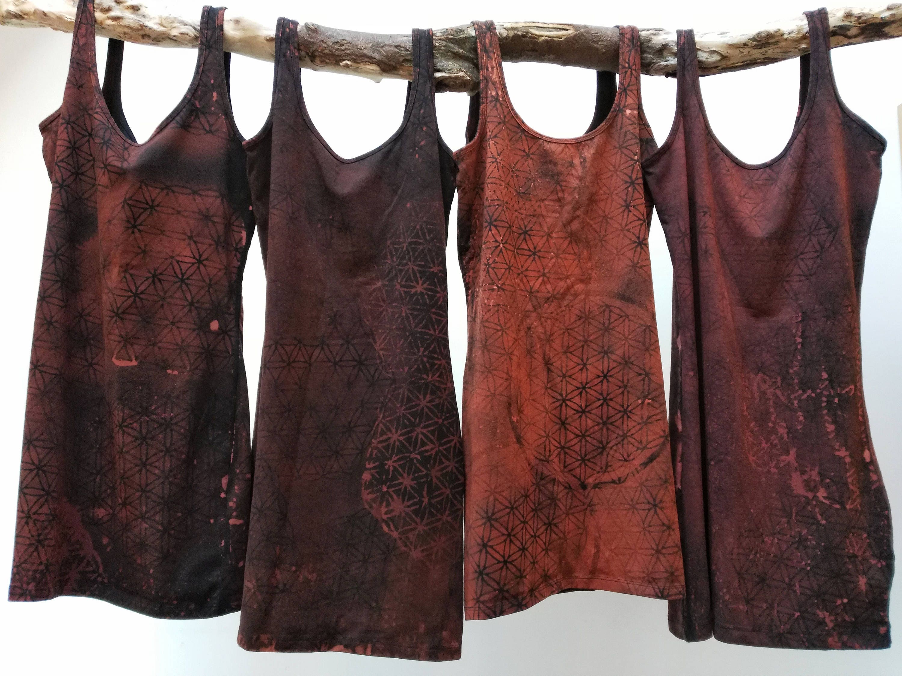 We now base these on plain tank dresses from the most ethical supplier we could find - EarthPositive! They are 95% organic cotton, produced soley using renewable energy sources by non-sweatshop workers. They are individually redesigned and hand-modified by Dusty Fingers in our live-in van. Each dress is unique, and just about the most ethical threads you could put on your