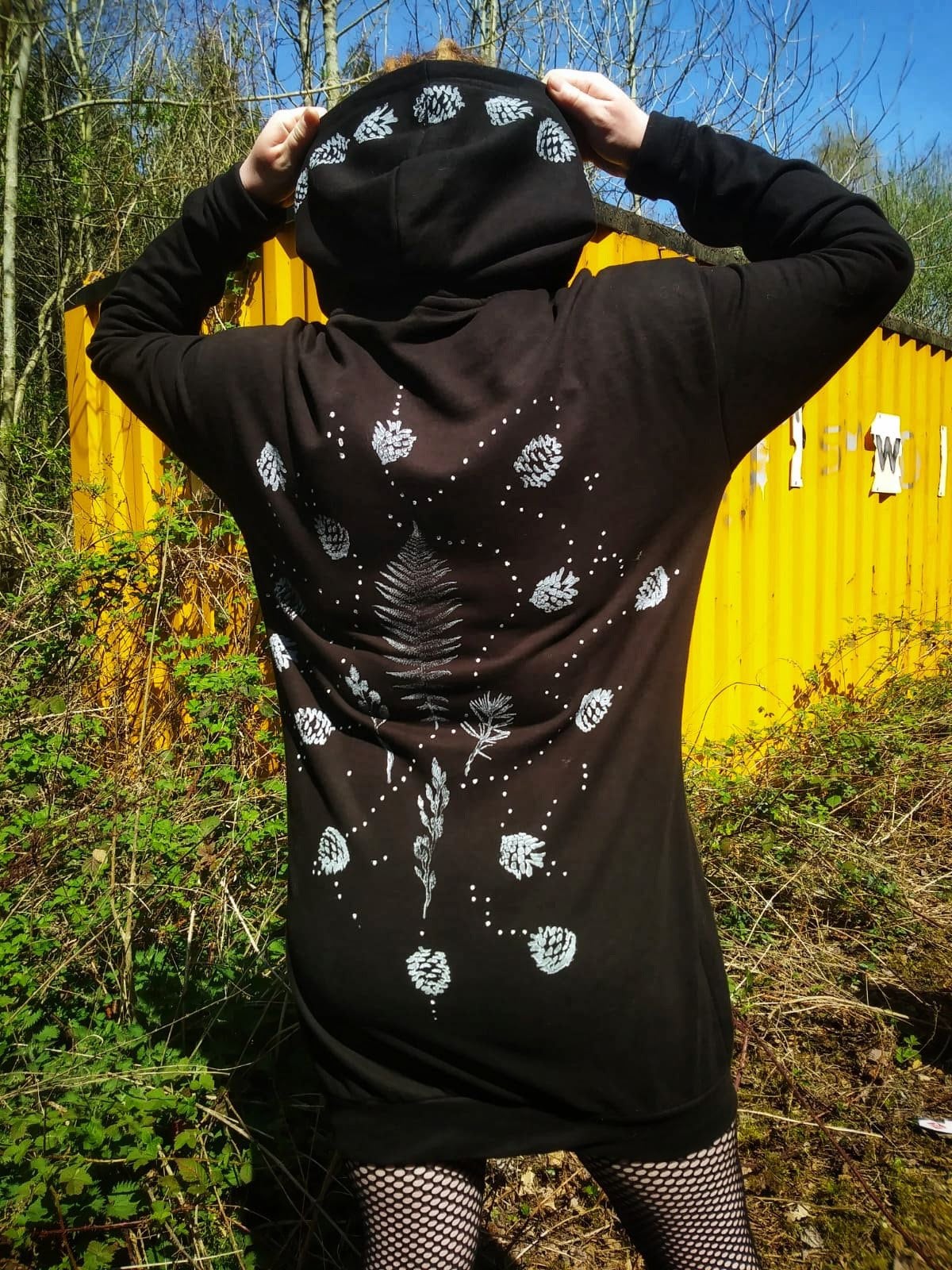 Organic cotton pullover hoodie dress, hand painted and block printed by Dusty Fingers.