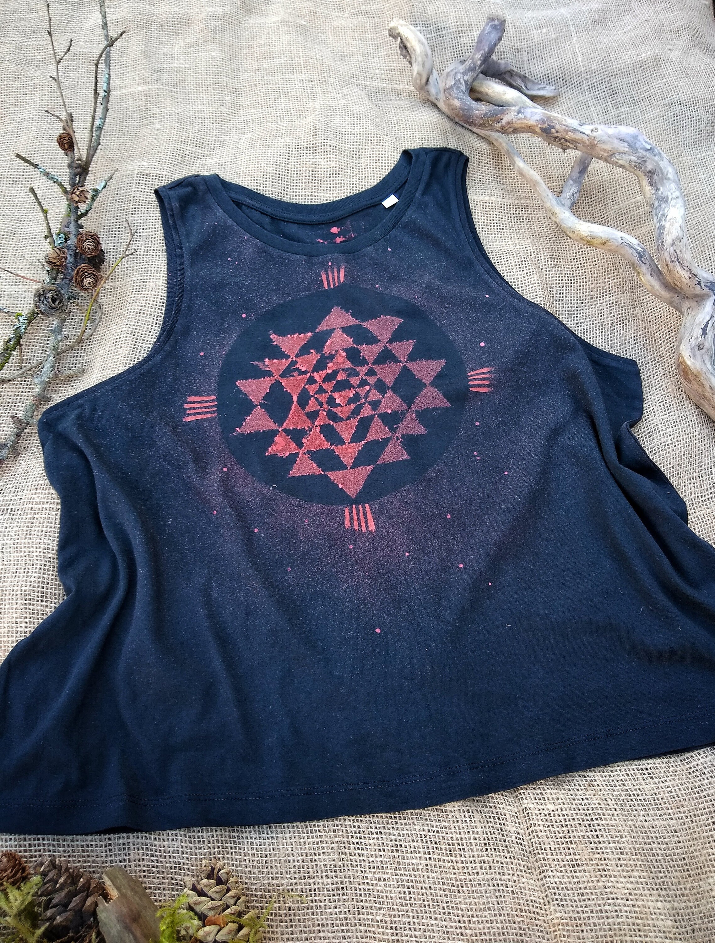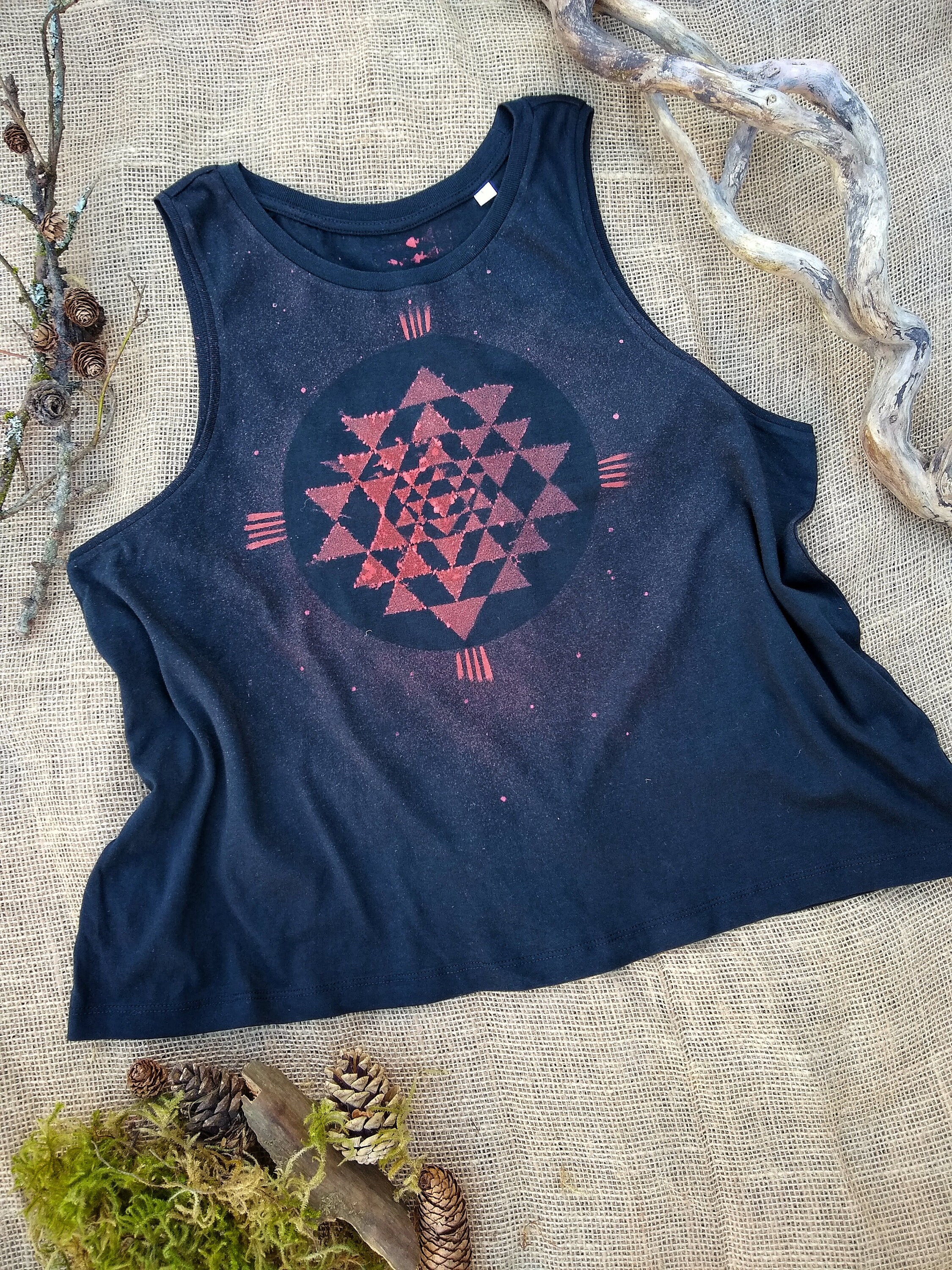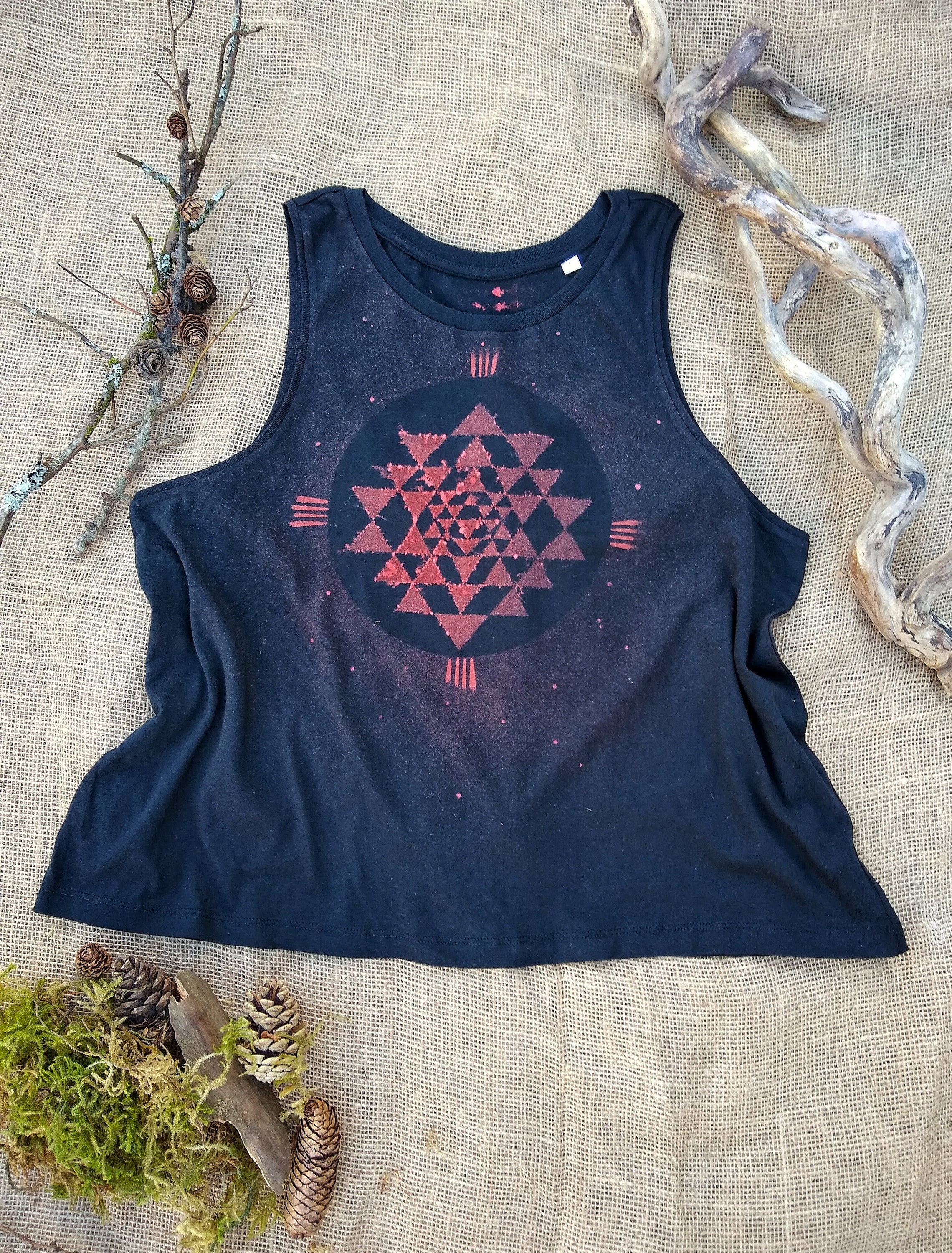 The women's sleeveless top is cut in premium 120gsm 100% organic cotton, and is complete with a hand-printed design of Shri Yantra - is a form of mystical diagram (yantra) used in the Shri Vidya school of Hinduism. It consists of nine interlocking triangles that surround a central point known as a bindu. These triangles represent the cosmos and the human body.
