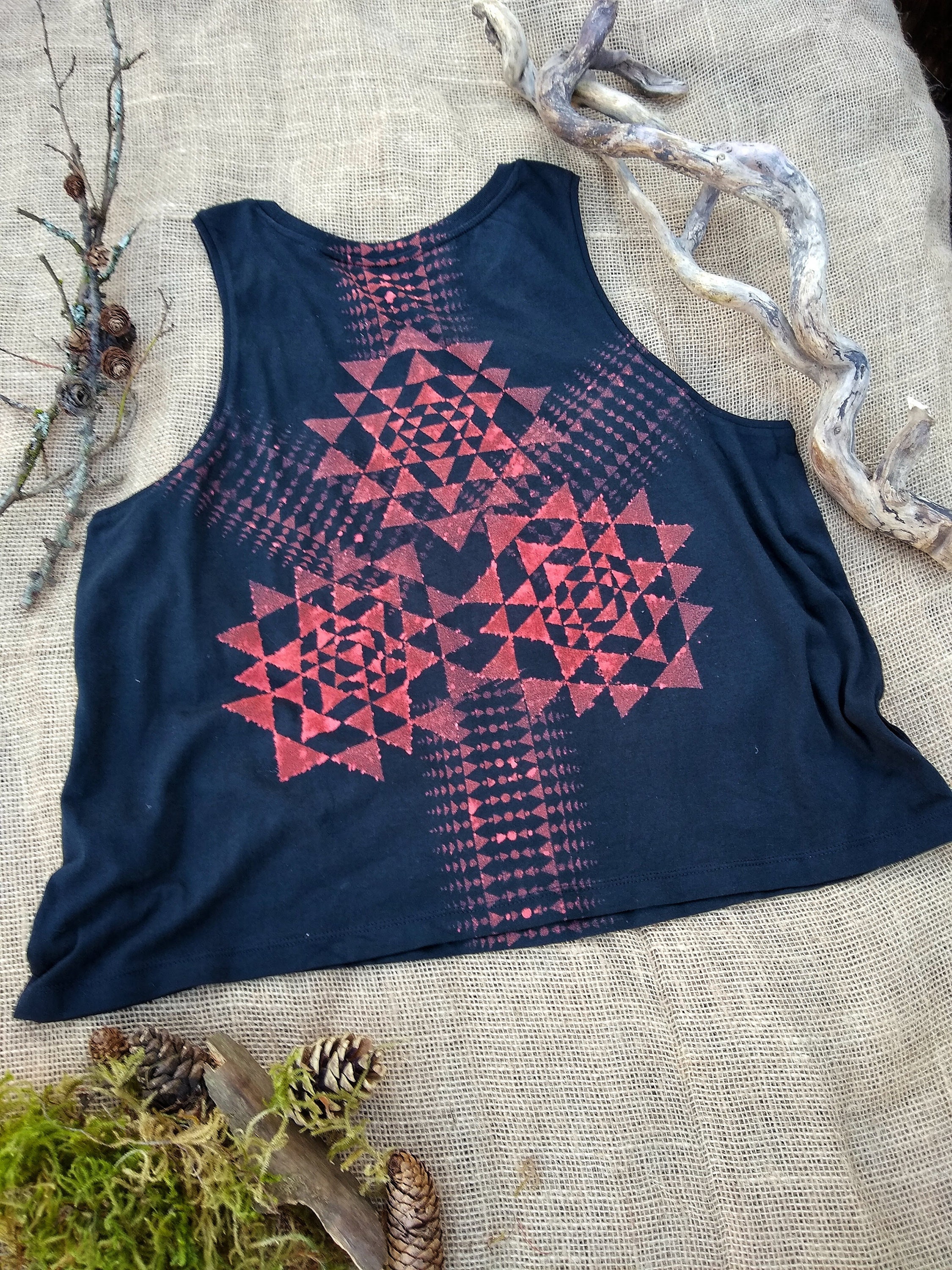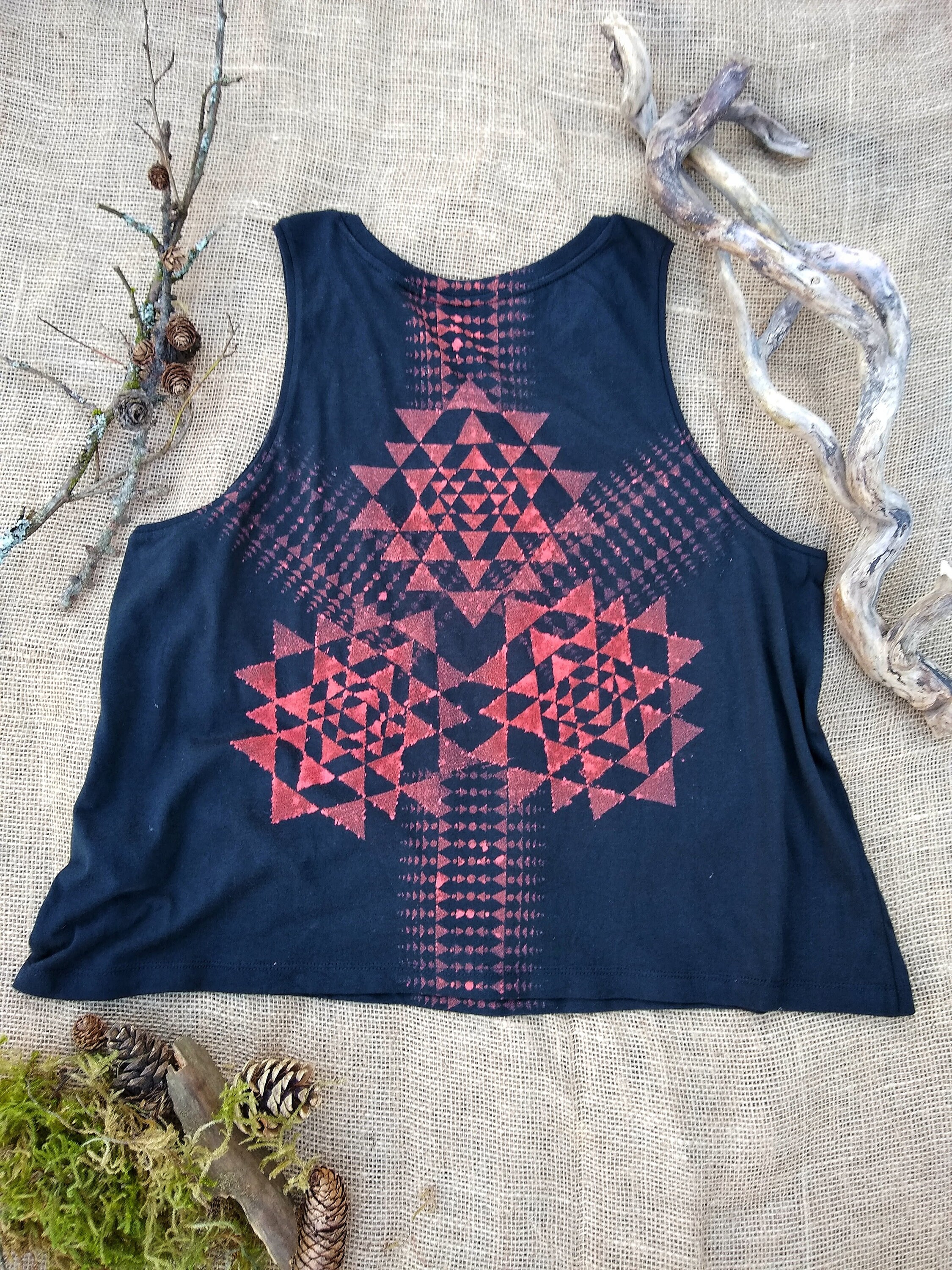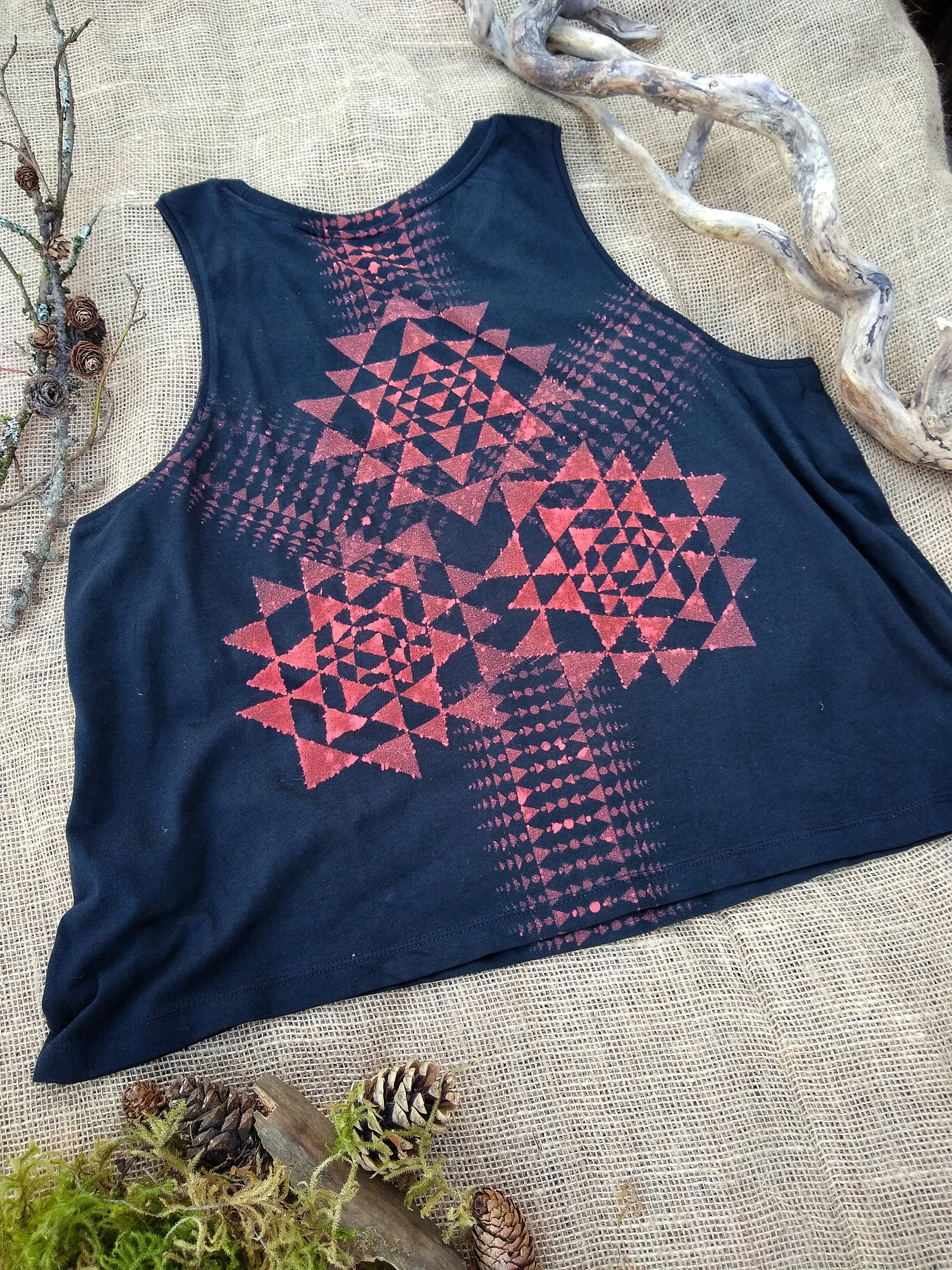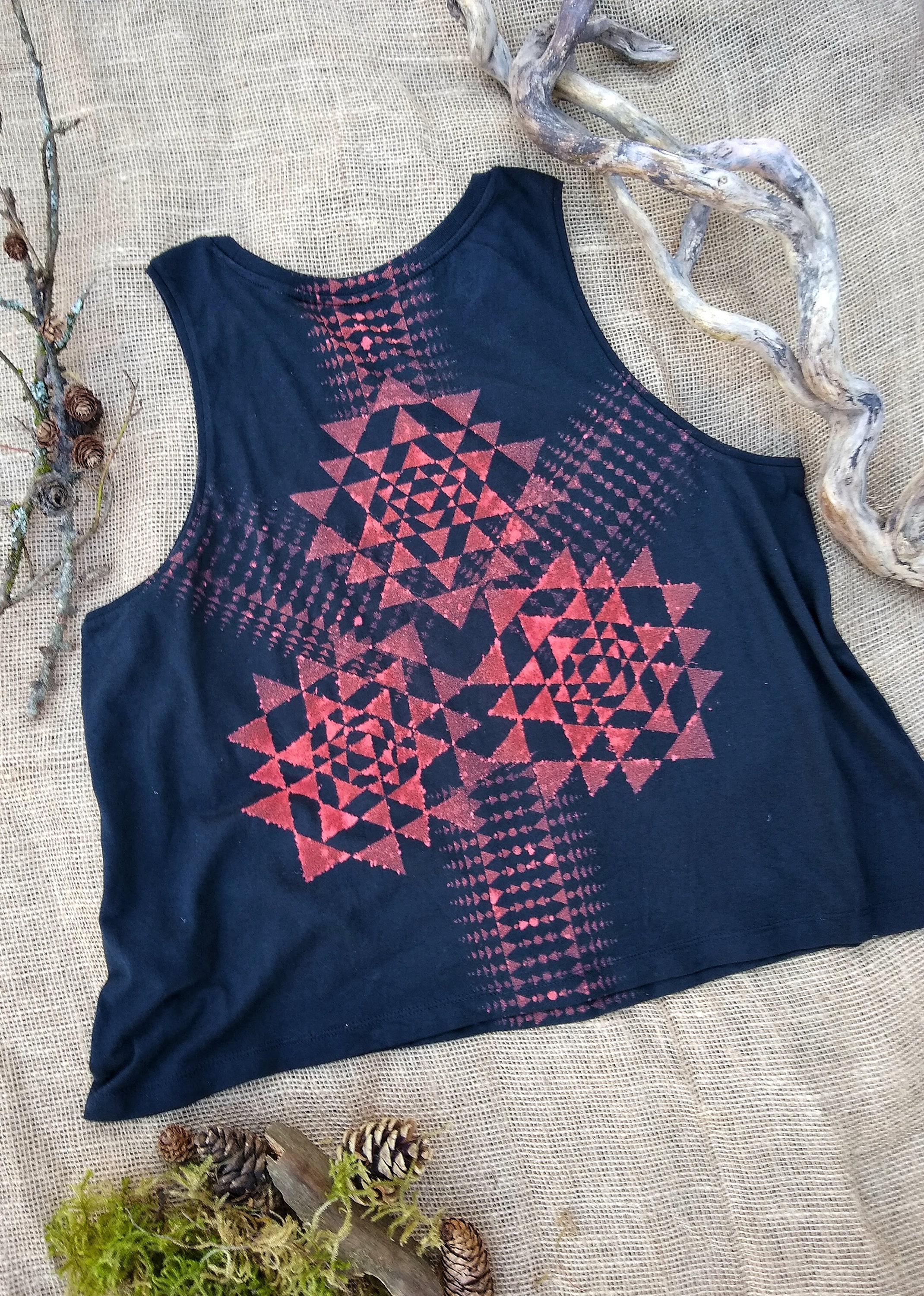 The women's sleeveless top is cut in premium 120gsm 100% organic cotton, and is complete with a hand-printed design of Shri Yantra - is a form of mystical diagram (yantra) used in the Shri Vidya school of Hinduism. It consists of nine interlocking triangles that surround a central point known as a bindu. These triangles represent the cosmos and the human body.