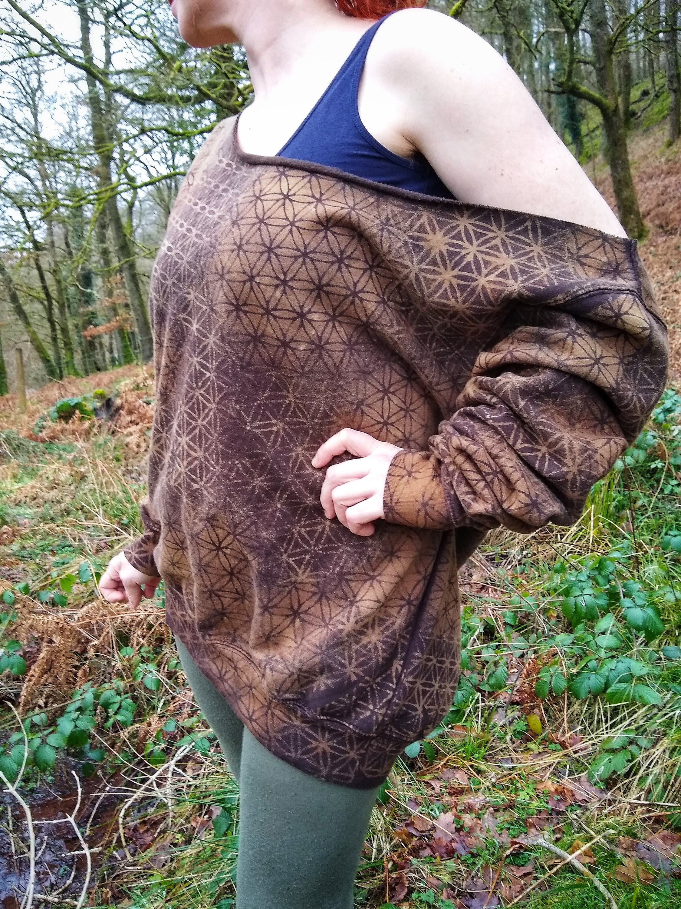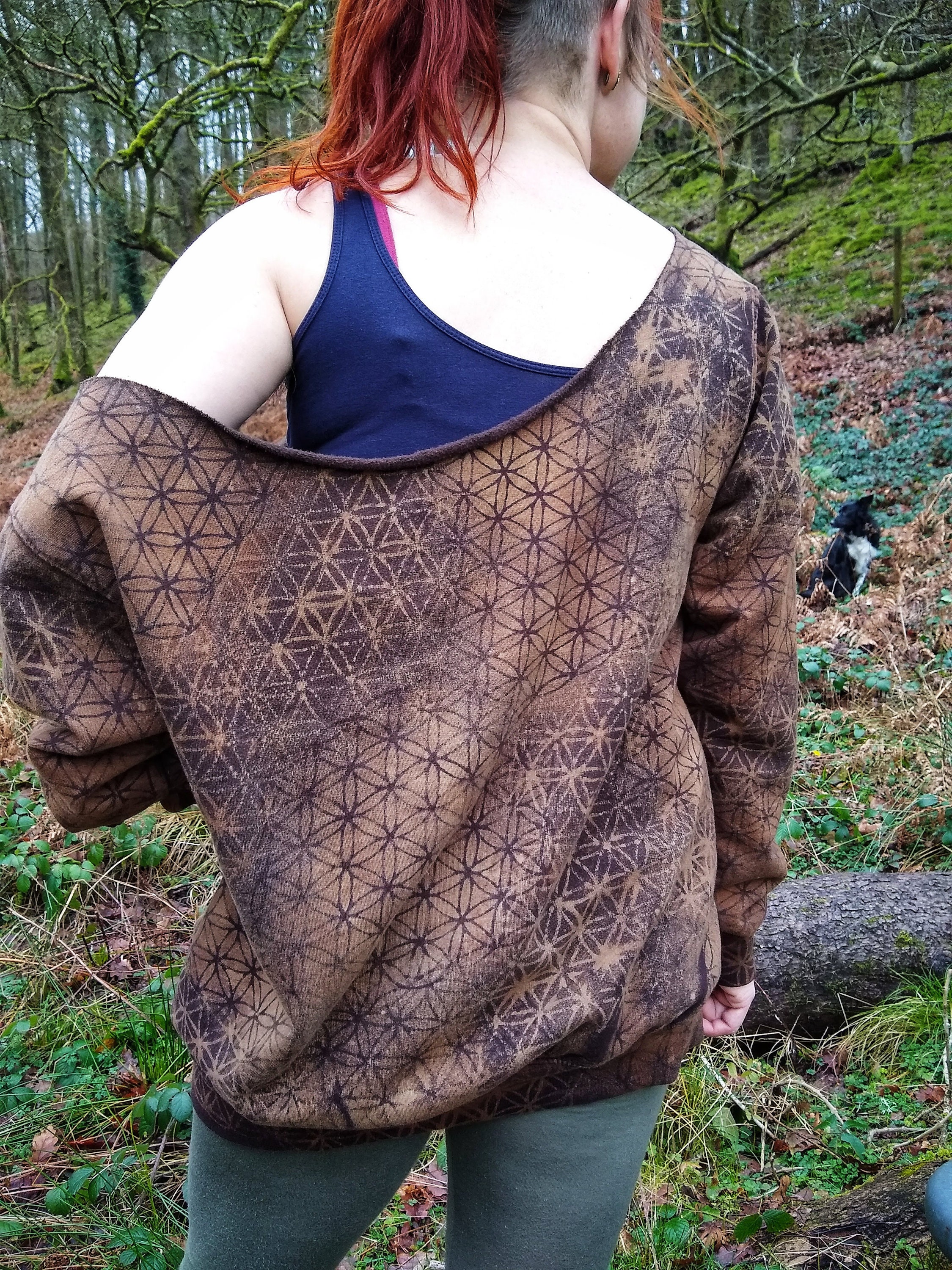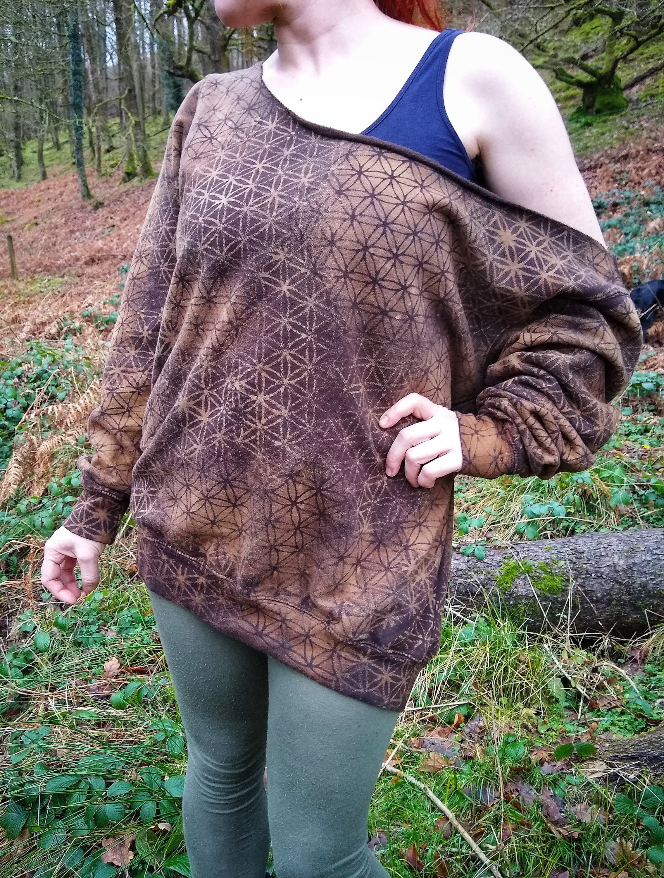 The model is size 10/12 and it's wearing an XL (for a slouchy look), colour: Hot Chocolate.