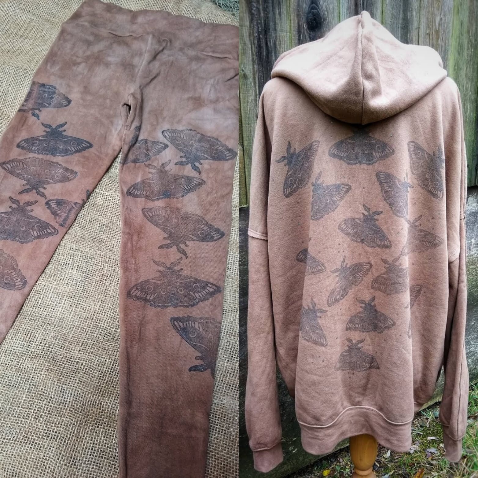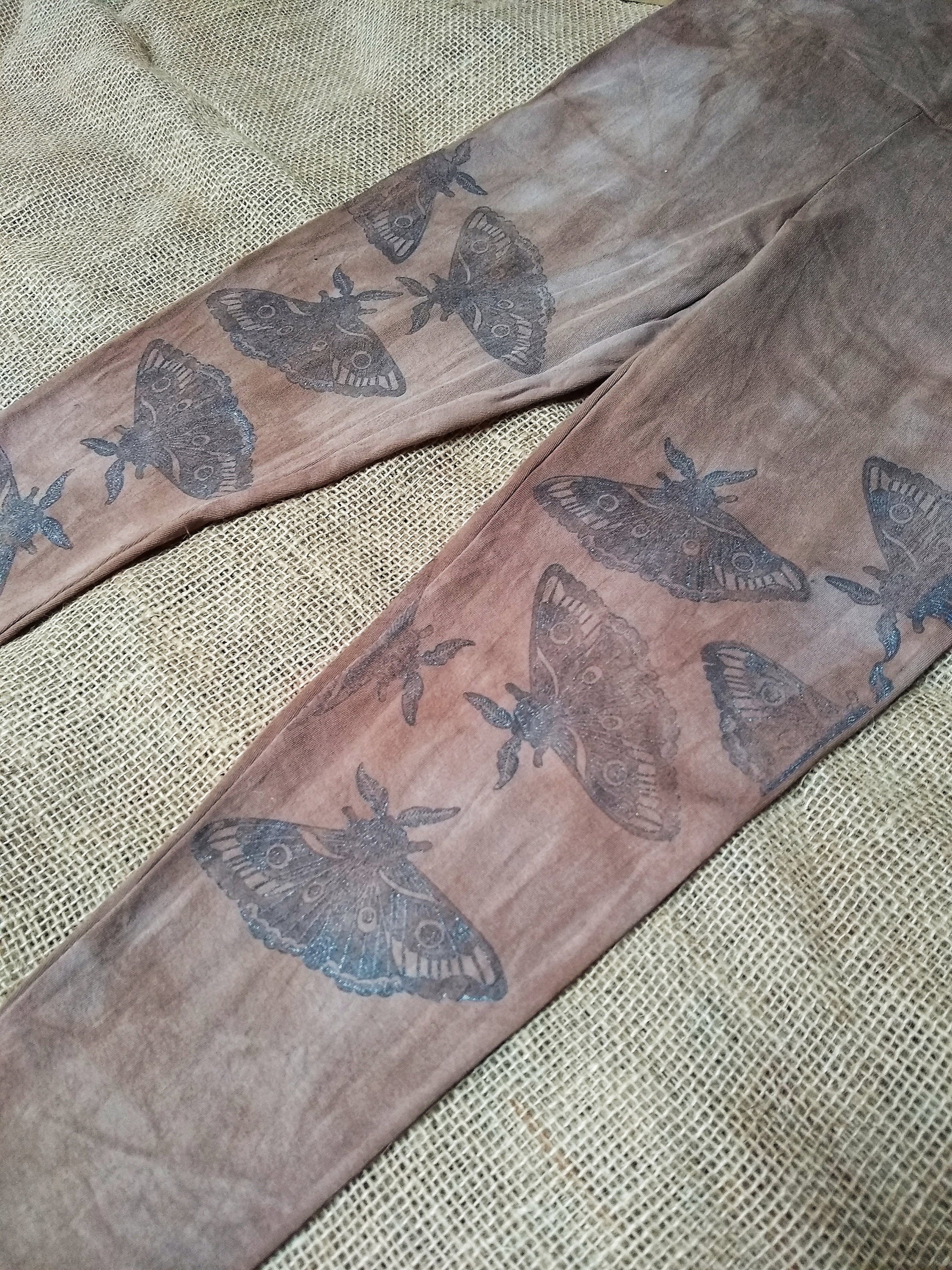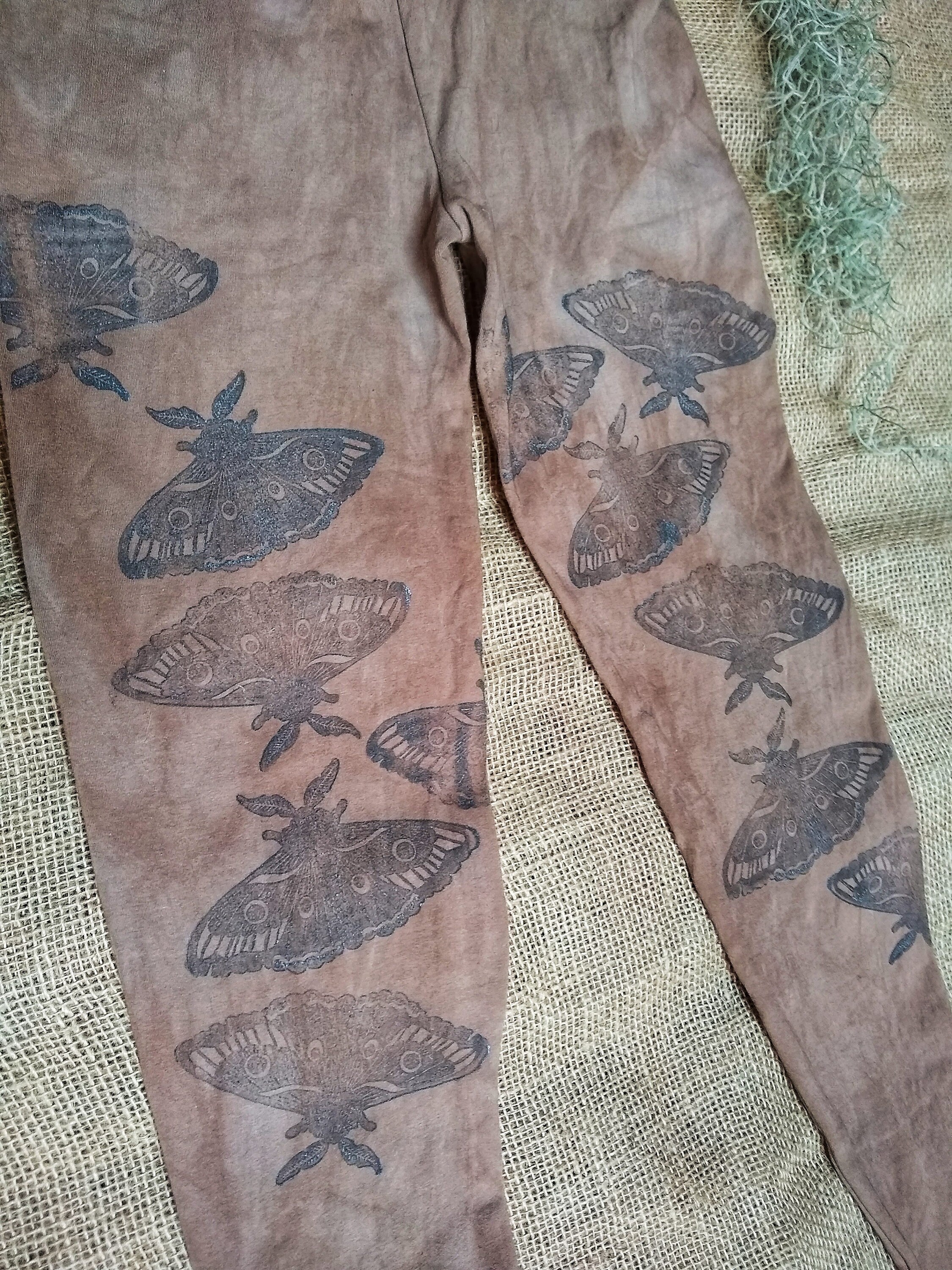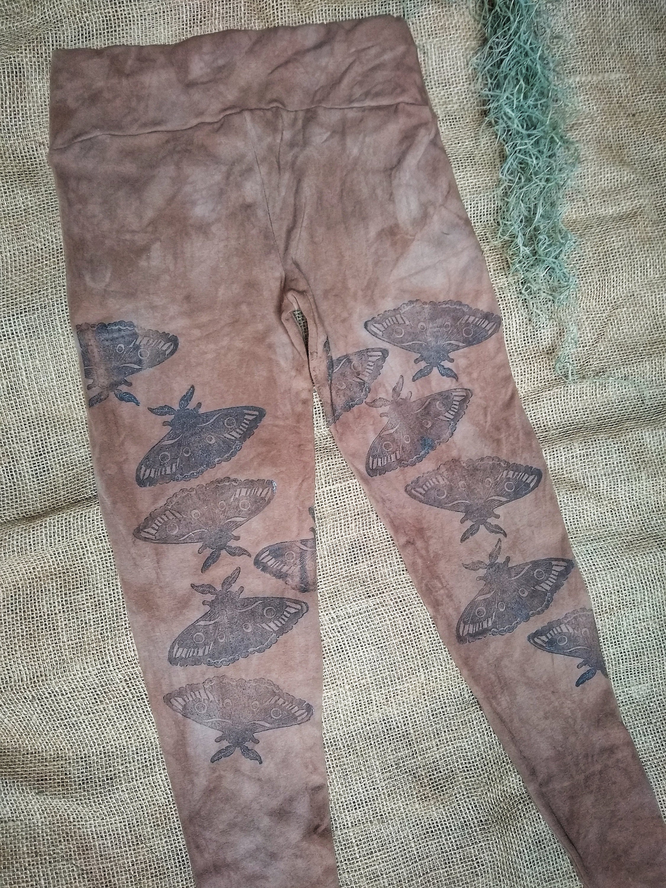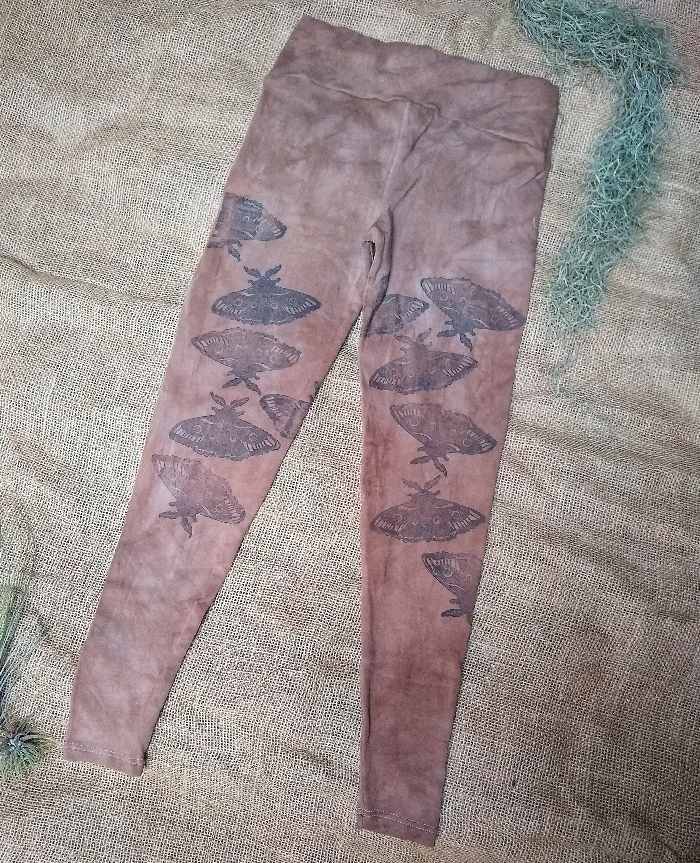 Hand-dyed, organic cotton leggings. Printed with hand carved lino cut by Dusty Fingers.