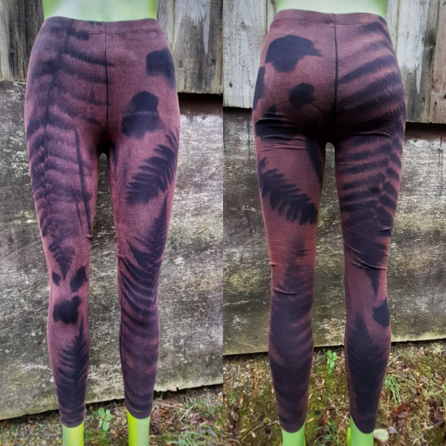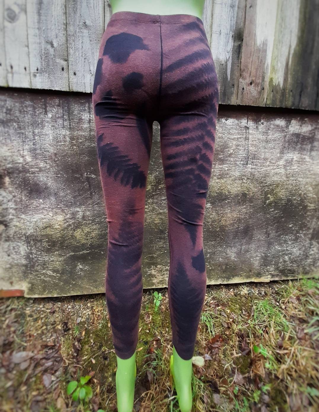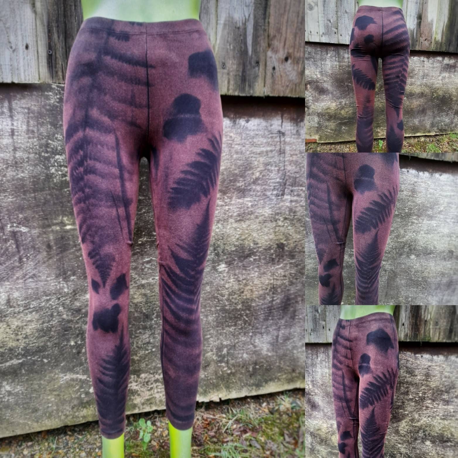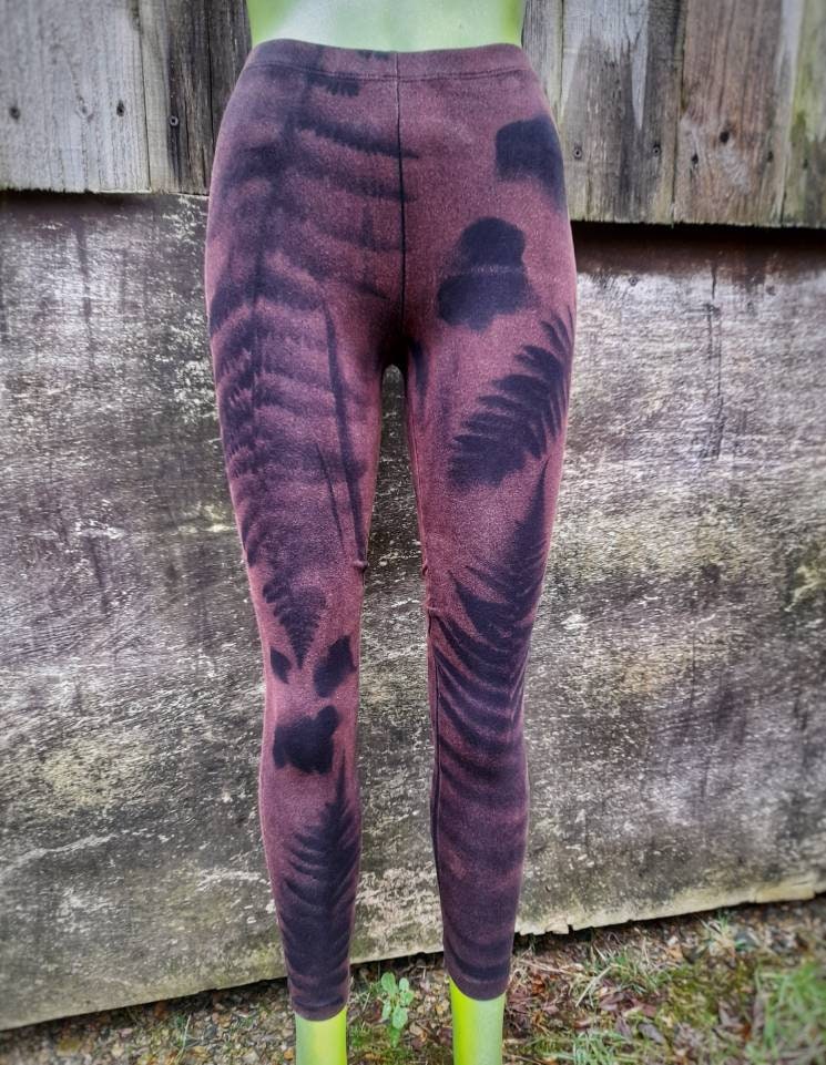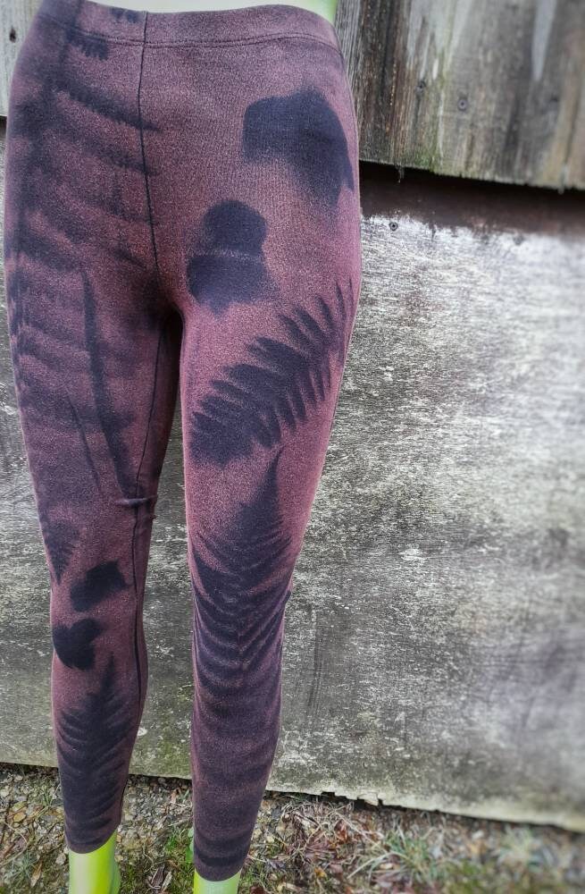 the coloring on the photo implies pink/purple, but the leggings themselves are extremely dark and more reddish brown. Nicely dyed, like the design